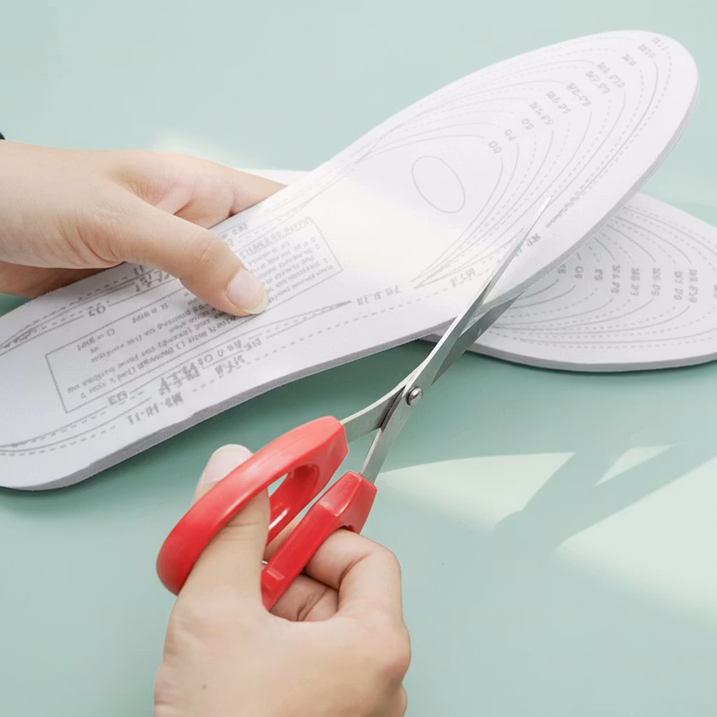 Du klipper enkelt skoinläggen till din individuella storlek (36-46) genom att använda mallen som är stämplad på baksidan av skoinläggen.