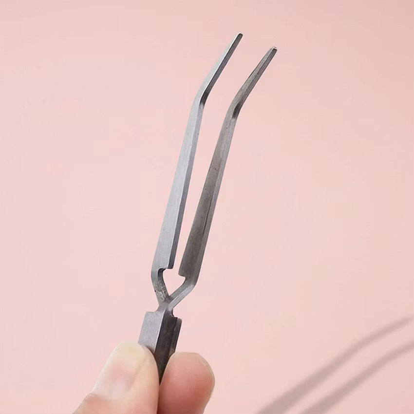 Här är en pincett som gör de små, pilliga jobben mycket enklare. Till skillnad från en vanlig pincett som du måste klämma åt, fungerar den här tvärtom – den greppar av sig själv. Du klämmer för att öppna den, och när du släpper taget håller den ett stadigt och säkert grepp.
