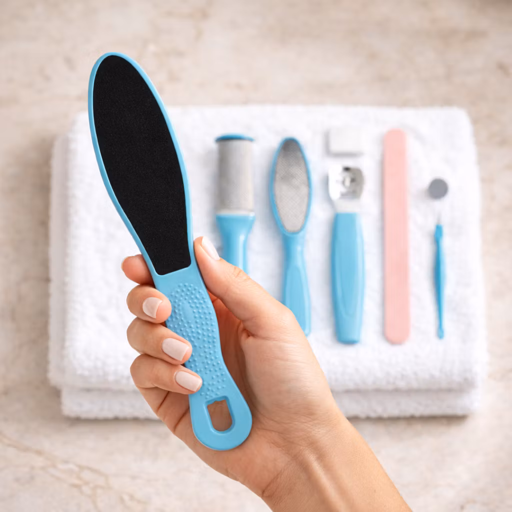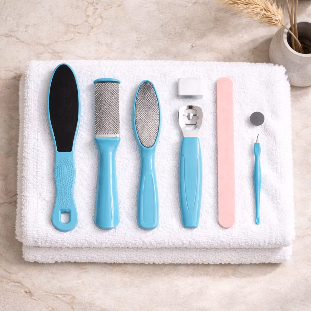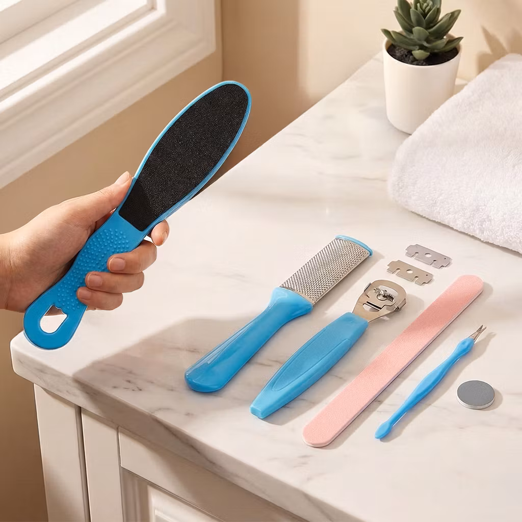 Ett fullspäckat set med sex olika verktyg och fotfilar som gör det enkelt och bekvämt för dig att fixa dina fötter. Ta bort hård och död hud, mjuka upp hårda hälar och ta bort fotförhårdnader enkelt. Fotfil, fotrasp, fothyvel, nagelbandskniv med mera.