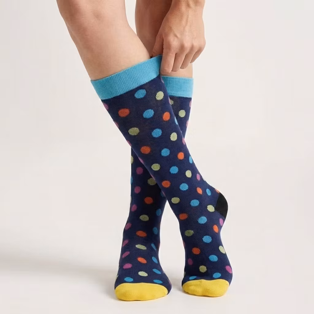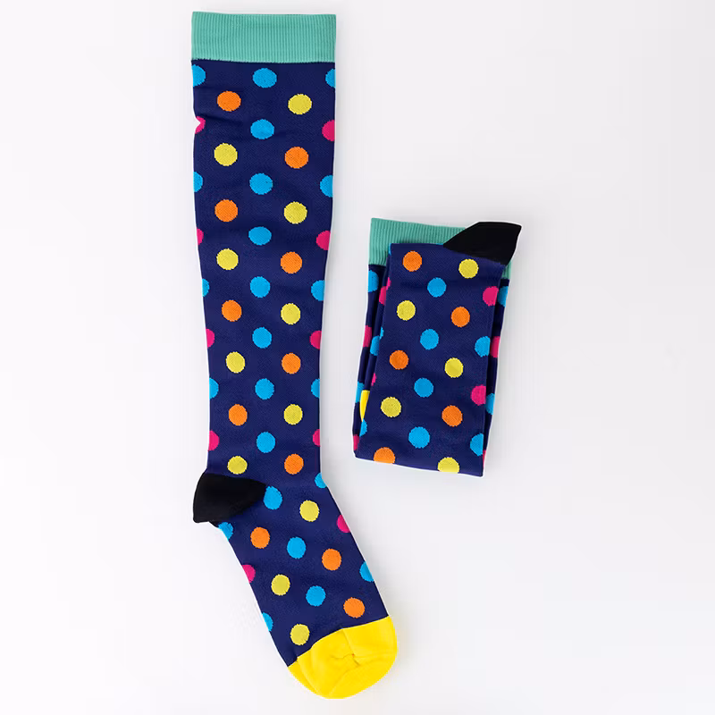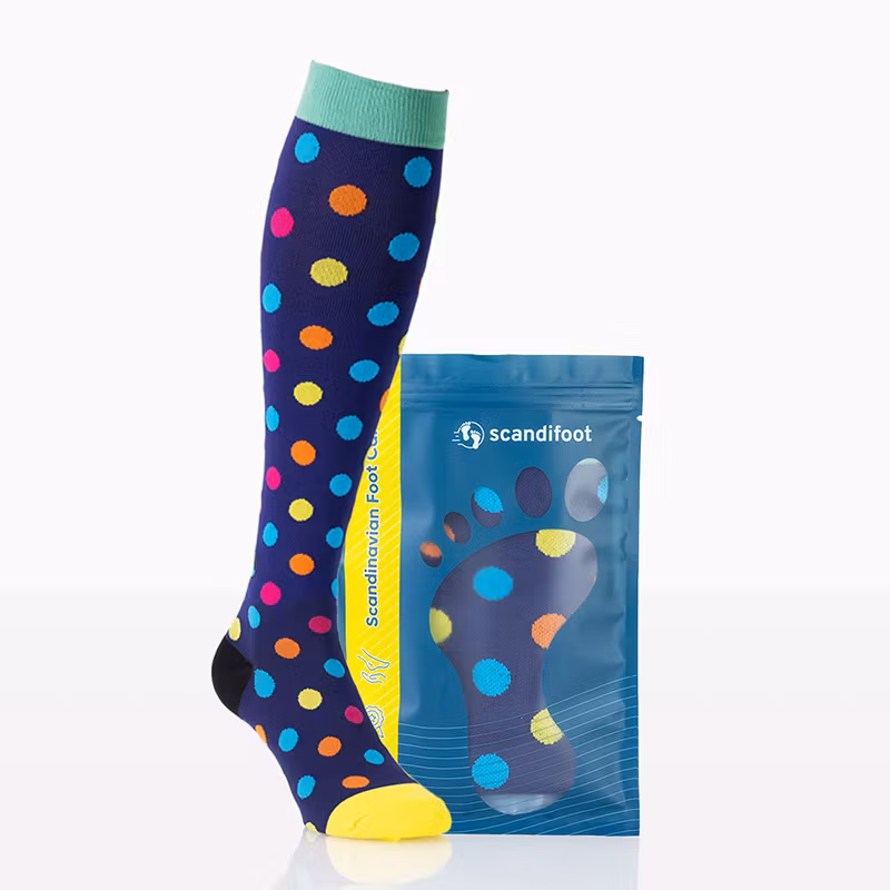 Stödstrumpor som fungerar perfekt när du står eller går mycket och vill ha extra komfort. Dessa färgglada stödstrumpor med härligt prickigt mönster och gör din omgivning glad.