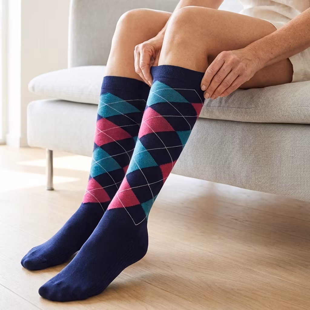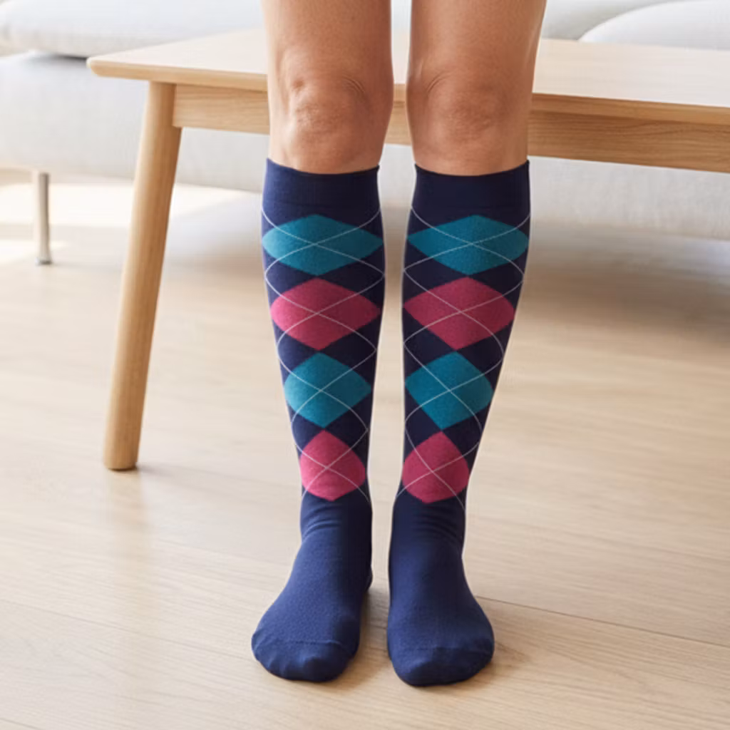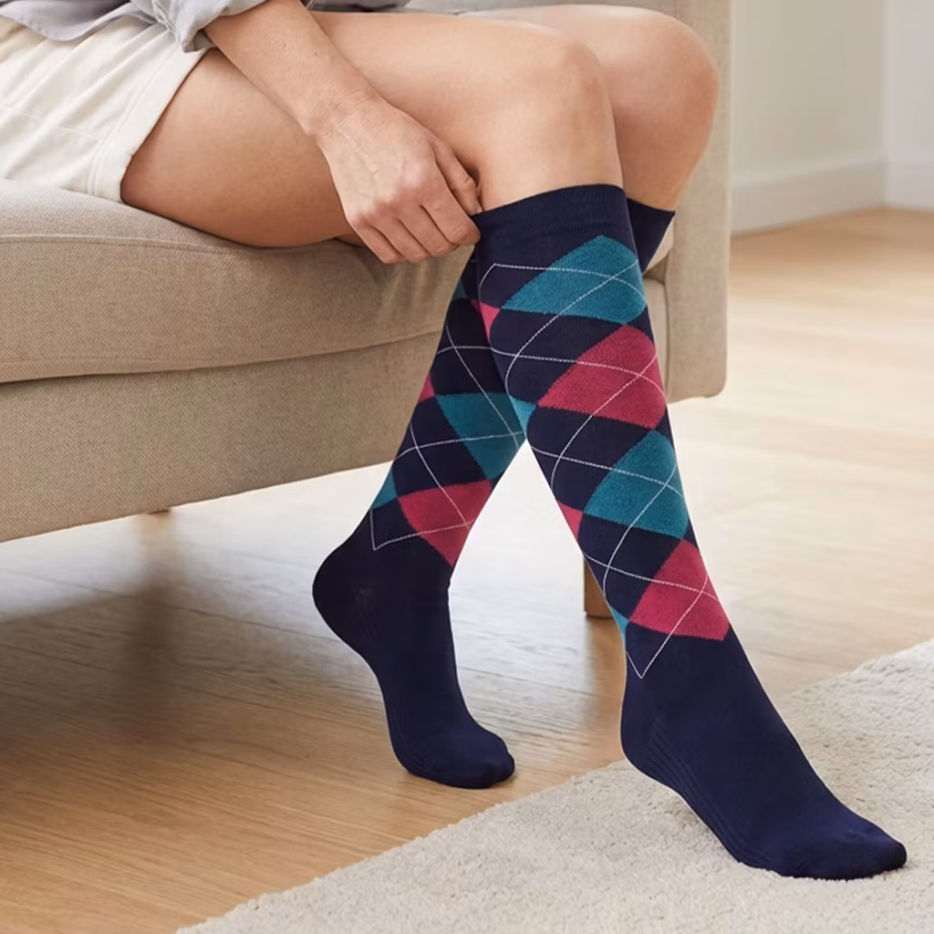 Ett par stilrena stödstrumpor i rutigt mönster – där design möter komfort. Strumporna omsluter benen mjukt och ger en behaglig, jämn känsla hela dagen. Perfekta för dig som vill kombinera funktion med en klassisk look.