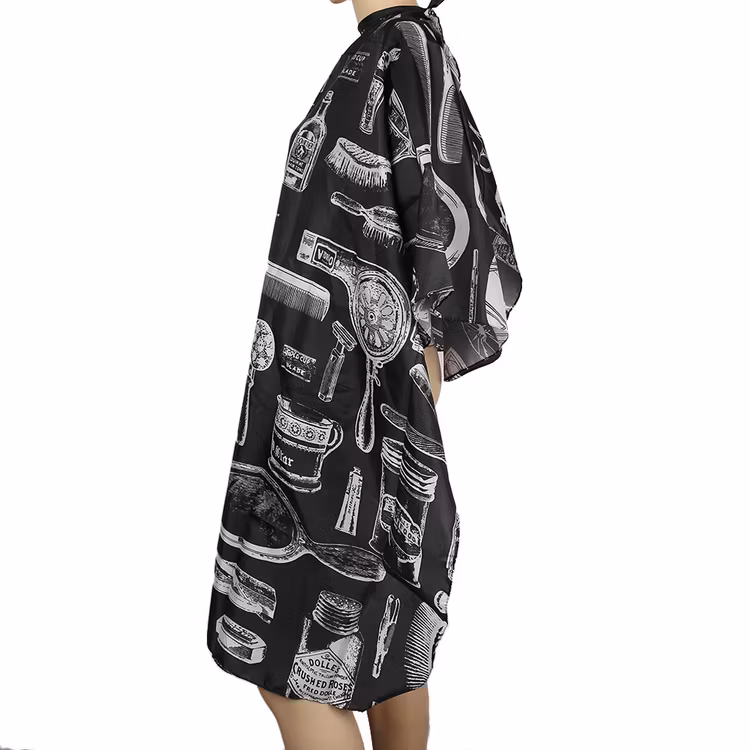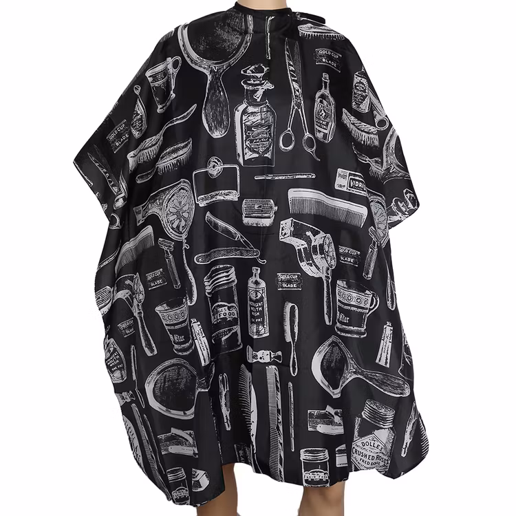 En stilren svart frisörkappa med snygga mönster i toppkvalité som skyddar dina kläder när du klipper ditt hår eller färgar håret. Frisörkappan är tål vatten och du kan använda den för så väl hemmabruk som på professionella frisörsalonger.