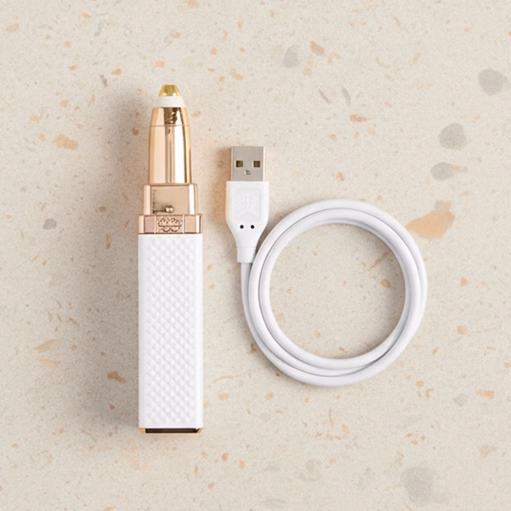 Med vår 2-i-1 trimmer blir det verklighet. Den är designad för att vara otroligt skonsam mot huden samtidigt som den effektivt tar bort minsta lilla hårstrå. Den har två utbytbara huvuden – ett för precision vid ögonbrynen och ett för större ytor som överläppen eller kinderna. Den inbyggda lilla lampan ser till att du inte missar ett enda hårstrå, och den eleganta designen gör att den ser ut som ett lyxigt läppstift. Perfekt att ha med i handväskan för en snabb touch-up när som helst.
