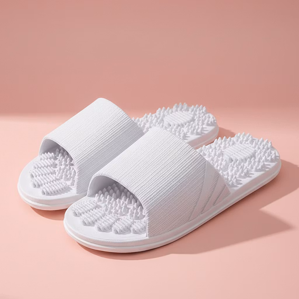 Tänk dig en dag utan trötta och ömma fötter. Istället för att lida av fotsmärtor kan du nu njuta av en behaglig fotmassage varje gång du tar ett steg. Tofflorna är flexibla och mjuka, och har flera massagepunkter på sulan som ger en avslappnande stimulans till dina fötter.